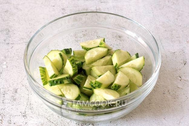 Огурцы слегка очистите от кожицы. Если они свежайшие, то можно только срезать кончики. Нарежьте огурцы произвольными кусочками или дольками.