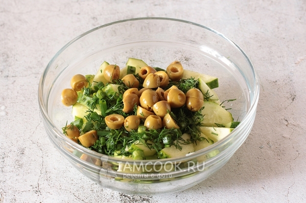 Оливки разрежьте пополам и также добавьте в салатник. Можно взять не только зеленые, но и черные оливки.