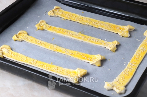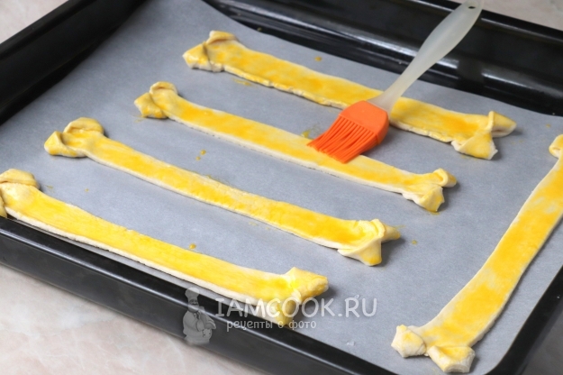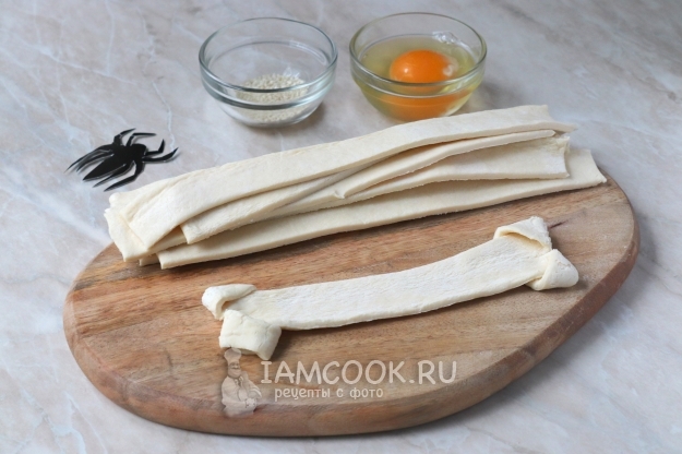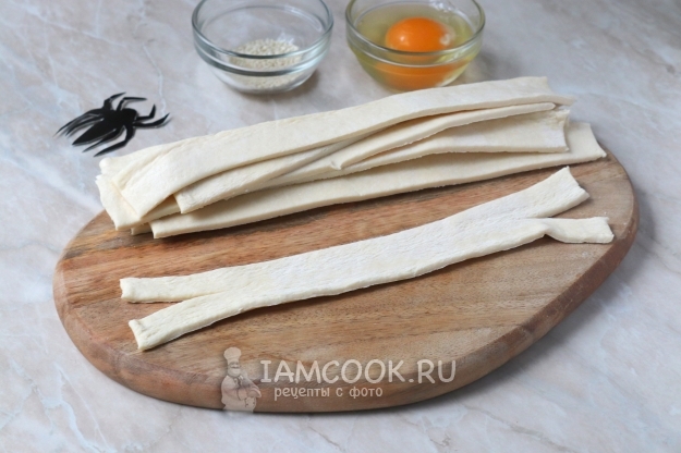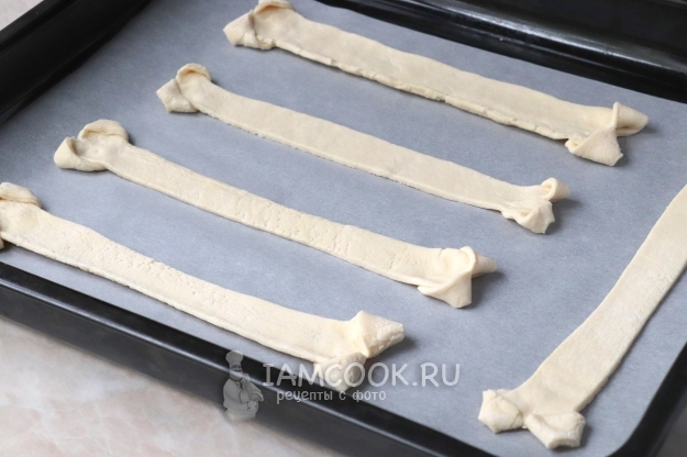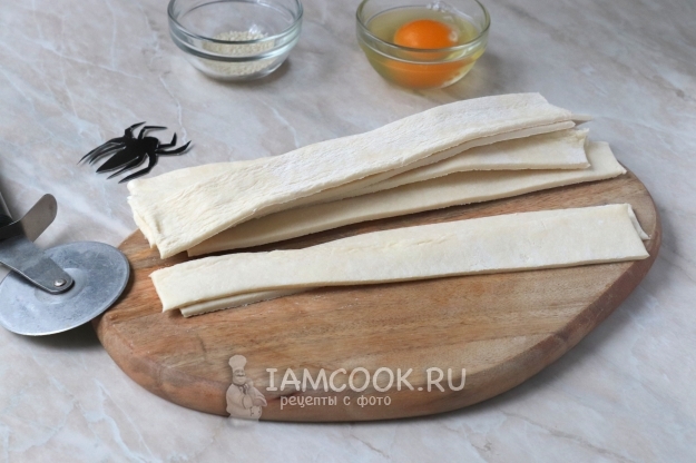 Тесто заранее достаньте из морозильной камеры и дайте ему оттаять при комнатной температуре. Затем с помощью роликового ножа разрежьте его на длинные полосы шириною около 2 см.
