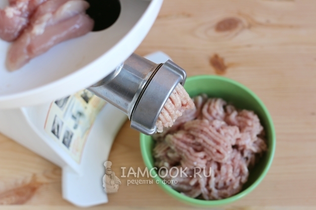 Куриное мясо без кожи прокрутим через мясорубку. Лучше всего подойдет мясо с бедрышек курицы.