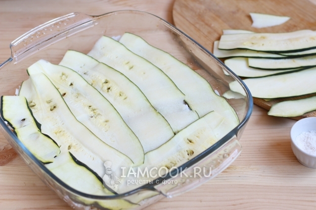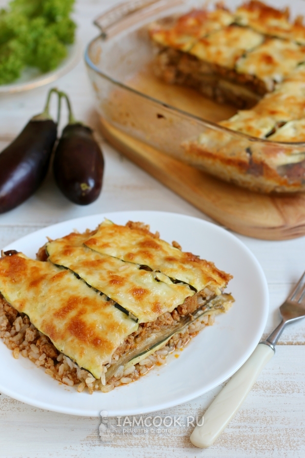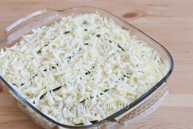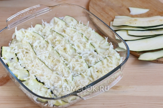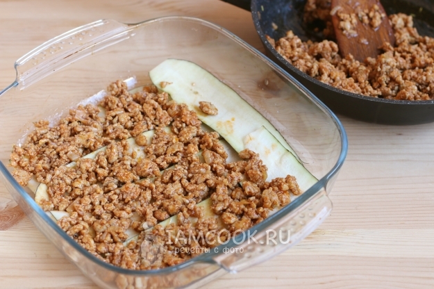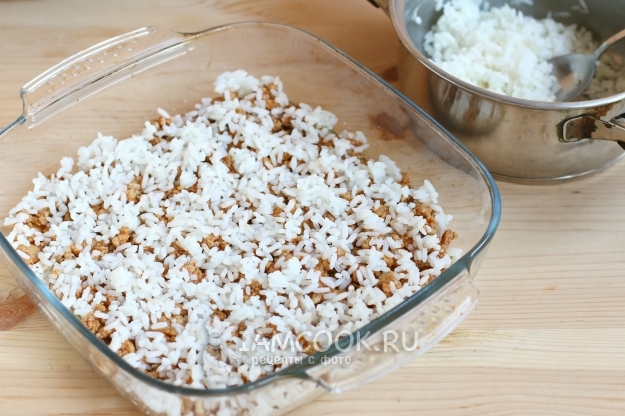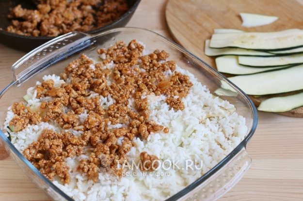 На сыр - еще слой цукини, затем слой риса и слой фарша.