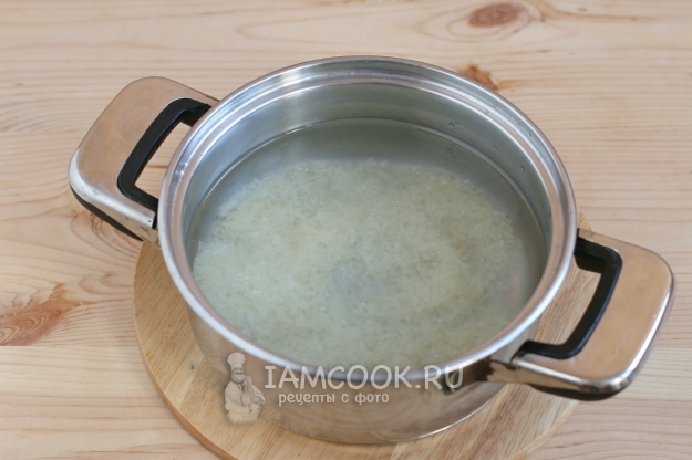 Так как в состав лазаньи будет входить рис, промоем его несколько раз, чтобы вода стала прозрачной, и поставим на плиту отвариваться до готовности. После закипания подсолим воду.