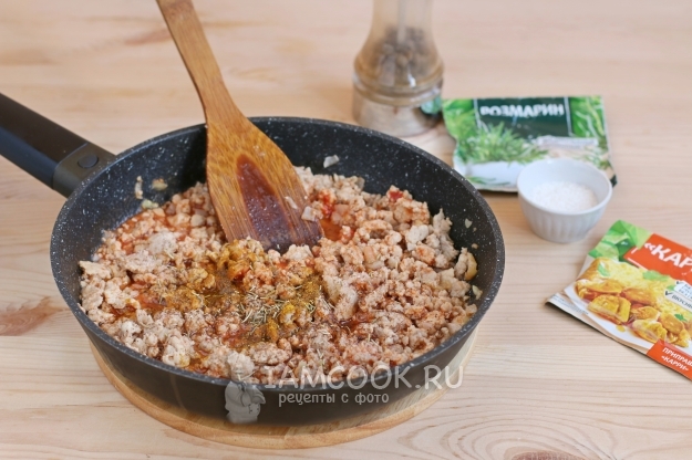 Добавим в сковороду к фаршу домашний томат, розмарин, карри, соль и перец по вкусу. Обжарим все вместе, помешивая, еще около 5-ти минут. Если домашнего томата нет, можно взять банку томатов в собственном соку или пассату.