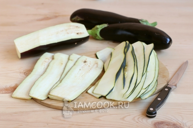 Когда мясная составляющая будет приготовлена, займемся овощами. Срежем хвостики у цукини и баклажанов. Нарежем их тонкими ломтиками около 3-4 мм толщиной.