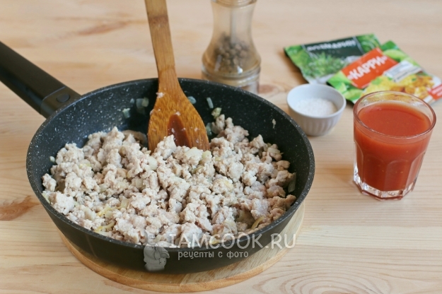Добавим куриный фарш, обжарим его, помешивая, в течение 3-х минут.