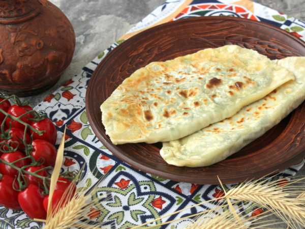 Тесто разделите на кусочки и каждый раскатайте в тонкую лепешку, на половину которой уложите порцию начинки из зелени и укройте второй половиной теста.