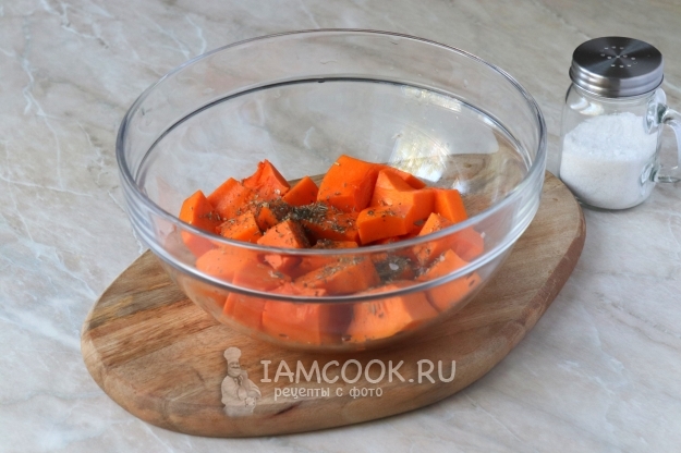 Тыкву очистить от кожуры и семян, после чего мякоть нарезать средними кубиками.