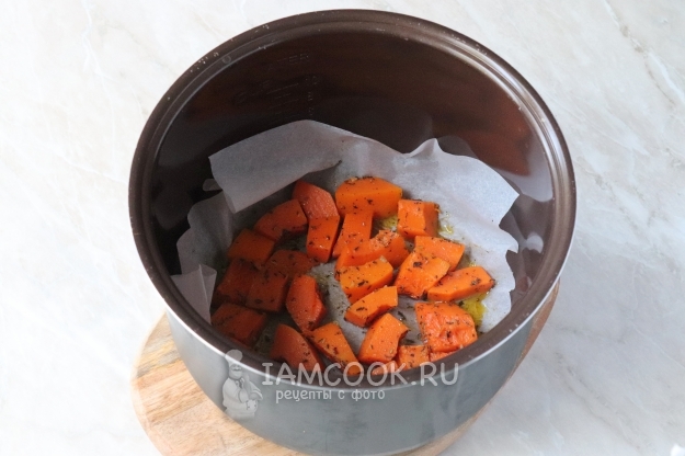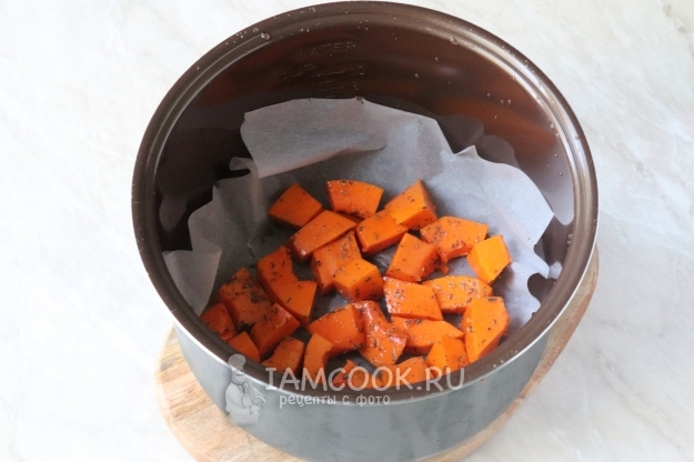 Чашу мультиварки застелить пергаментом и выложить подготовленную тыкву. Закрыть крышку и выбрать режим "Выпечка".