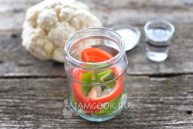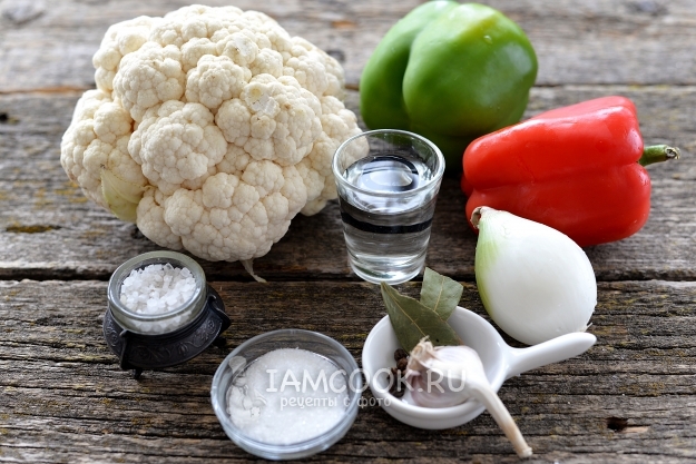 Подготовьте продукты для заготовки маринованной цветной капусты с перцем на зиму. Овощи помойте, обсушите. Лук и чеснок почистите. Помойте и простерилизуйте банки удобным для вас способом.