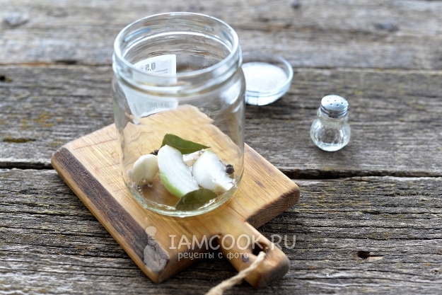 Простерилизуйте удобным для вас способом банки. На дно разложите поровну перец, лавр, гвоздику, чеснок и по несколько ломтиков репчатого лука.