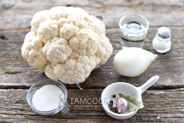 Продукты для приготовления маринованной цветной капусты на зиму без стерилизации подготовьте по списку. Лук и чеснок почистите, помойте под проточной водой вместе с цветной капустой.