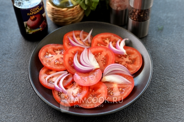 Красный лук нарежьте полукольцами, разложите по помидорам.