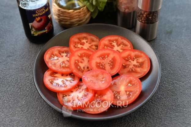 Помидоры нарежьте кружочками, выложите на плоское блюдо.