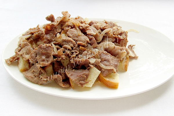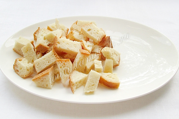 Пока жарится мясо нужно нарезать хлеб средними кусочками. Разложить его на одну часть блюда.
