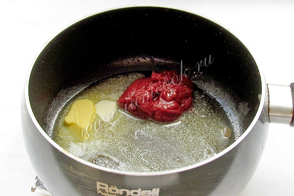 Приготовить подливу-соус. Для этого нужно растопить сливочное масло, смешать его с томатной пастой. Добавить щепотку сахара, чтобы сгладить кислоту пасты и немного все вместе прожарить.