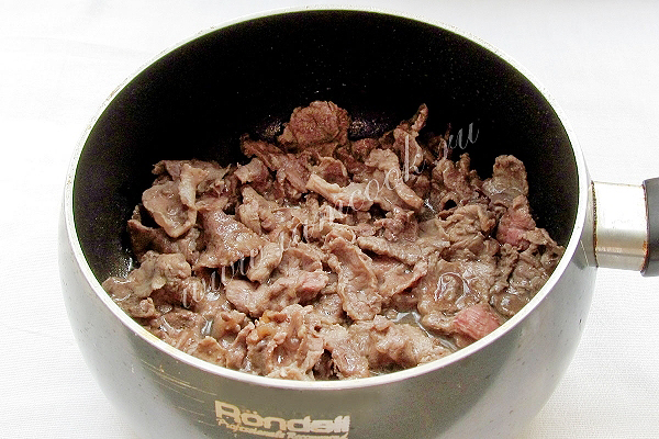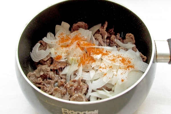 Лук нарезать очень тонкими полукольцами и добавить к мясу. Посыпать красным перцем. Жарить до смягчения лука.