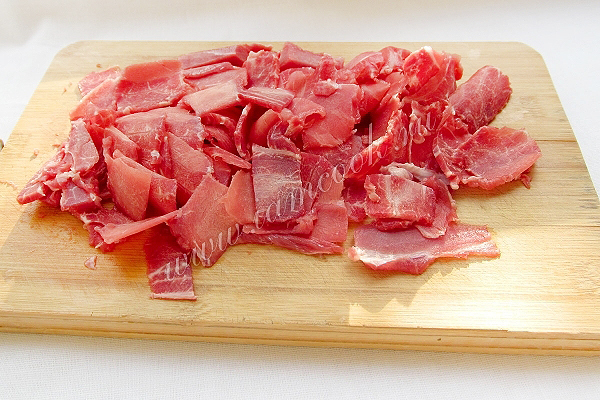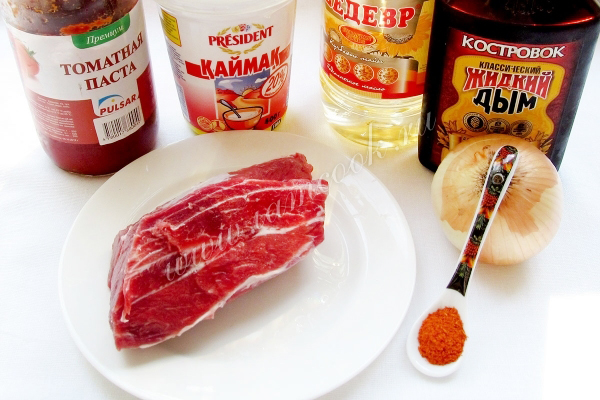 Говядину, в слегка подмороженном виде, нарезать очень тонкими , прозрачными ломтиками. Сбрызнуть жидким дымом.