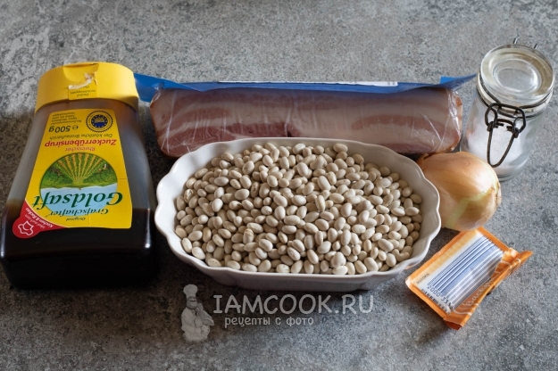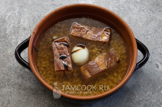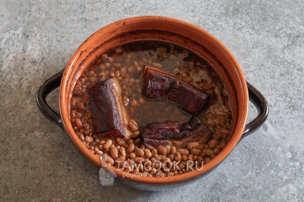 Выкладываем фасоль, бекон и луковицу в керамический горшок, поливаем мелассой. Вливаем столько воды, чтобы фасоль была покрыта этак на 2 пальца. Важно, чтобы и мясо было покрыто в начале варки тоже.