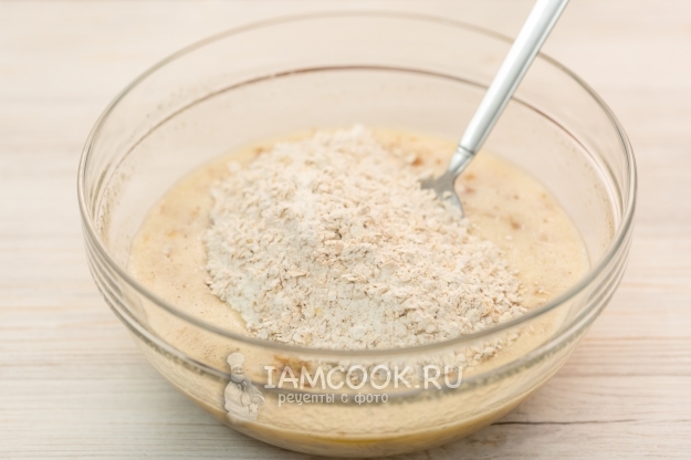 Добавьте муку, смешанную с пряничной смесью, хлопьями, разрыхлителем.