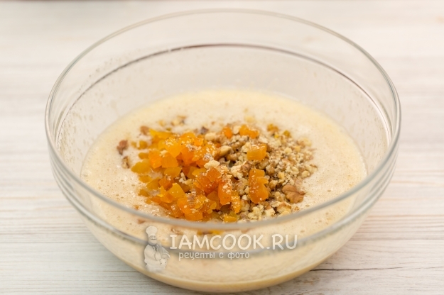 Добавьте нарезанную кубиками курагу и измельченные (не в пыль!) орехи.