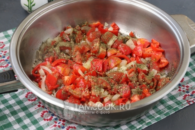 Кубиками или небольшими кусочками нарезать помидоры, добавить их в сковороду. Овощи посолить, посыпать сухими травами. Можно использовать смесь трав или какую-нибудь одну, например орегано или базилик, можно ещё карри добавить. Готовить ещё 5-7 минут.