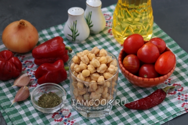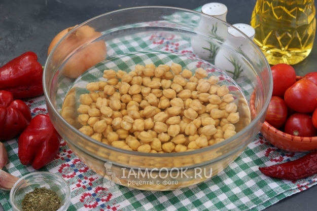 Утром нут промыть, сложить в кастрюлю и залить свежей водой. Поставить на огонь и варить до готовности 45-60 минут, за 5 минут до окончания варки посолить. Время варки может колебаться в зависимости от сорта. Пока нут варится, мелко нарезать чили и чеснок, кубиками - лук, и соломкой - сладкий перец.