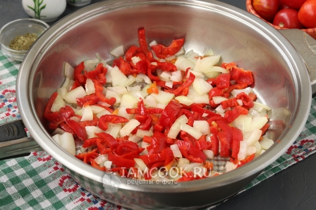 В сковороде разогреть растительное масло, высыпать нарезанные овощи и готовить на небольшом огне 8-10 минут.