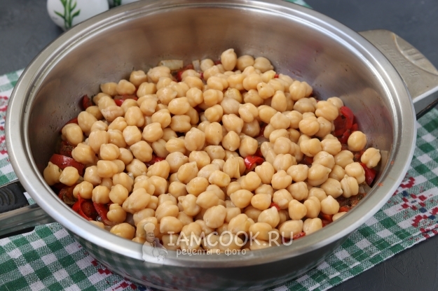 Затем к овощам добавить готовый нут, перемешать, накрыть крышкой и готовить 3-5 минут.