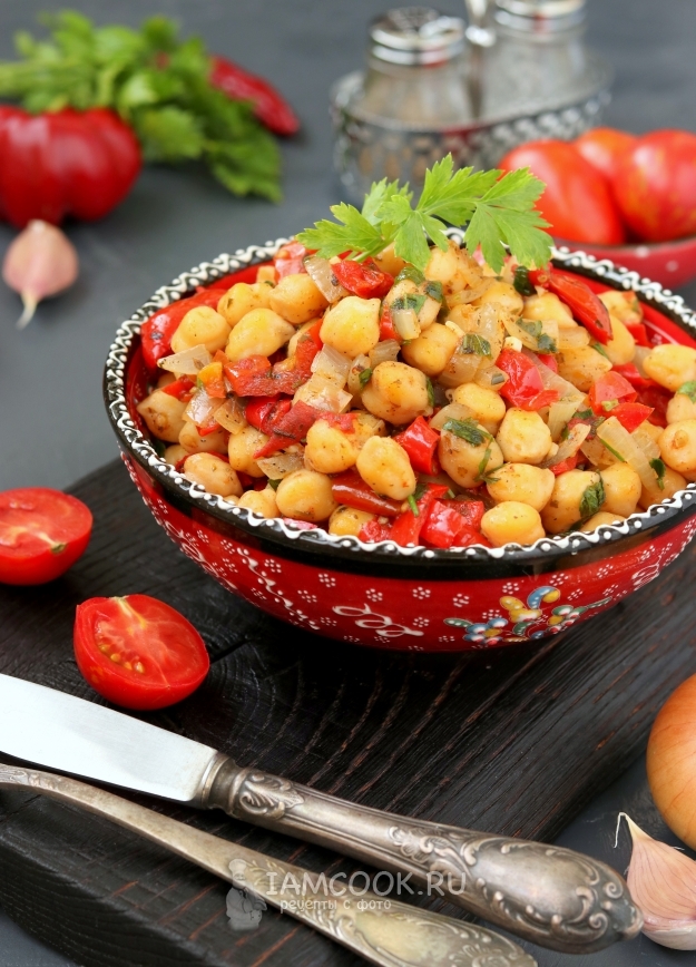 Нут со сладким перцем и помидорами вкусен и в тёплом, и в холодном виде.