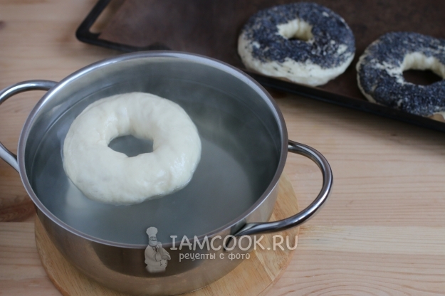 Итак, вскипятим воду в кастрюле (объём видно на фото), добавим в нее столовую ложку сахара. Будем опускать в кипяток каждую заготовку на 15-20 секунд, поливая сверху бублик горячей водой при помощи ложки. После вынимаем его шумовкой из воды, укладываем на противень и посыпаем щедро маком. Можно насыпать мак в тарелку и после обварки окунать бублик в мак, а потом класть на противень, делайте как вам удобнее. Все шесть бубликов как раз умещаются на одном противне. Сразу ставим противень с бубликами в разогретую духовку на средний уровень и печем 15-20 минут.