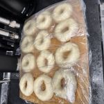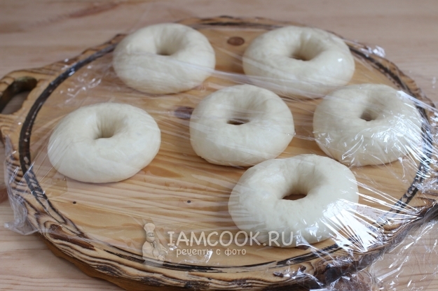 Через 20 минут в каждой заготовке сделаем отверстие пальцем и растянем ее, придавая форму бублика. Снова накроем пленкой и оставим еще на час-полтора.