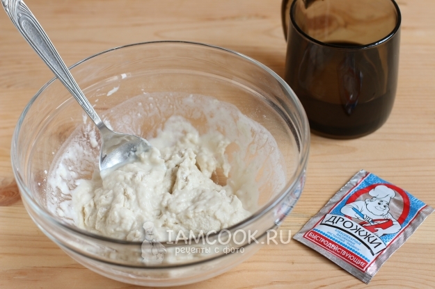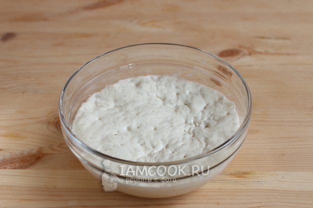 Всыпаем остальную часть муки и замесим эту самую опару, она будет непривычно густой, совсем не такой, как, например, я делаю для пирожков. Поэтому нужно такой густой опаре дать время для подъема примерно 3,5-4 часа при комнатной температуре 20-24 градуса. Накроем миску с опарой полотенцем и оставим в покое, а в это время можно заняться другими домашними делами.