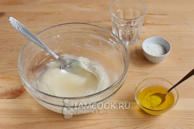 Добавляем в опару сахар, остальную воду, смешиваем. Маргарин заранее растопим, остудим и смешаем с солью.
