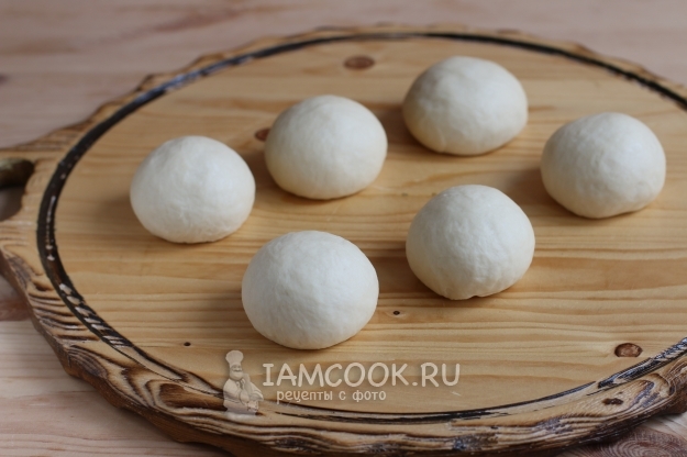 После замеса разделим тесто на шесть равных частей, вес каждого будет примерно 116-118 г, а после выпечки вес уменьшится до 100-102 г. Раскатаем заготовки в плотные упругие шарики и накроем пищевой пленкой, оставим на 20 минут.