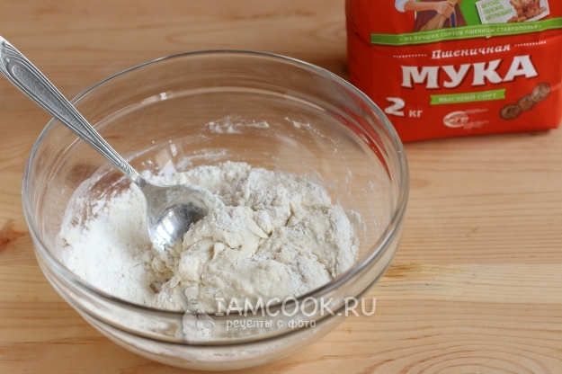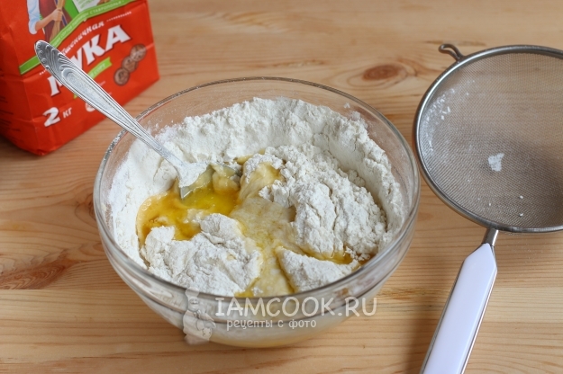 Просеиваем в опару половину муки для теста и вливаем масло с солью, смешиваем. Просеиваем остальную муку, но граммов 30 оставим и будем ее добавлять по необходимости во время ручного замеса.