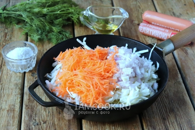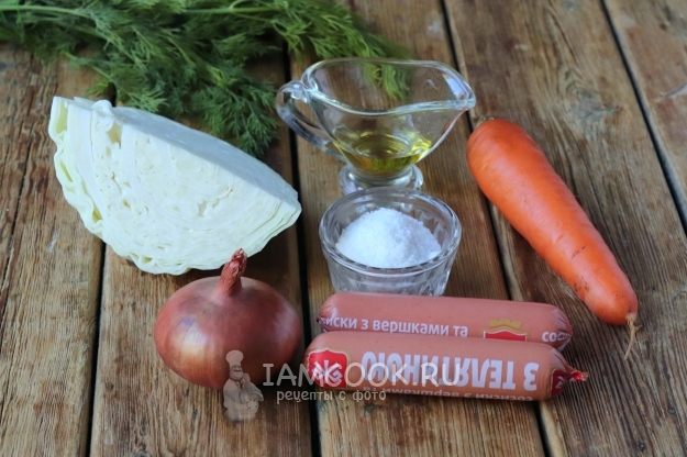 Для приготовления жареной капусты с сосисками на сковороде подготовьте продукты по списку к рецепту.