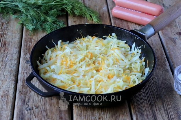 Освободите сосиски от защитной оболочки и нарежьте кружочками. Отправьте их в сковороду к жареной капусте.