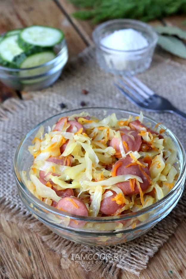 Жареная капуста с сосисками - простое, но очень вкусное блюдо. Приготовить его сможет каждый, даже начинающая хозяйка. Главное, приобрести качественные продукты. Капусту лучше выбирать светлую, с тонкими сочными листиками, а сосиски - только высшего сорта. Кроме соли и чёрного молотого перца, в блюдо можно добавлять разнообразные специи, в зависимости от ваших вкусовых предпочтений.
