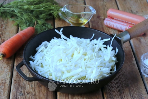 Белокочанную капусту нашинкуйте тонкими длинными полосами и выложите на сковороду.