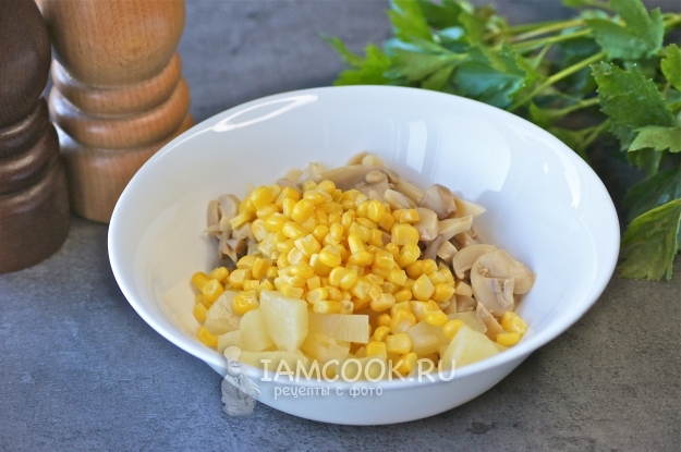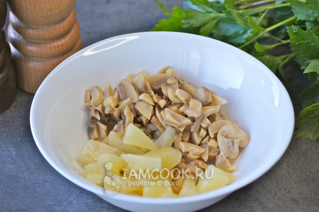 В салатник выложите нарезанные шампиньоны и ананасы.