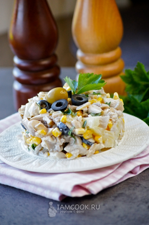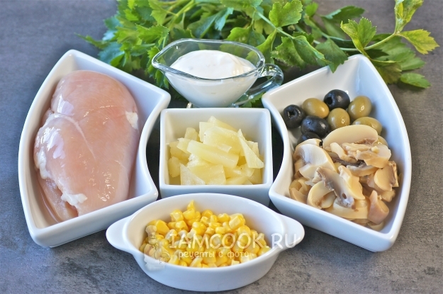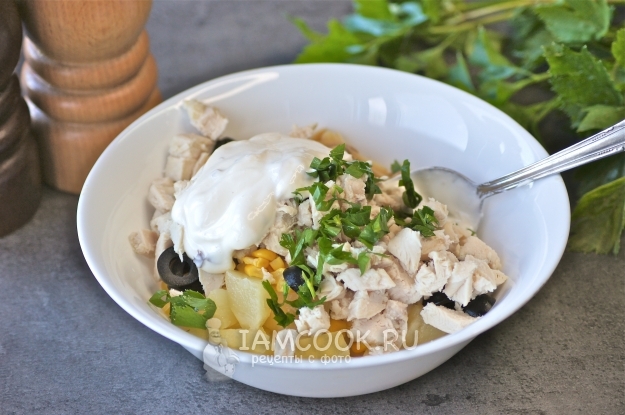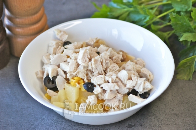 Вкусный и легкий салат «Шанхай» с курицей и ананасами готов.