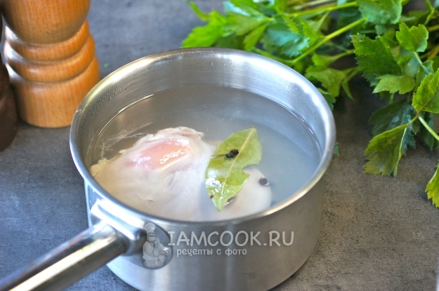 В сотейник налейте воду, доведите до кипения, опустите мясо, добавьте перец горошком, лавровый лист и соль, варите на умеренном огне около 15 минут.