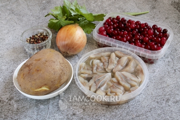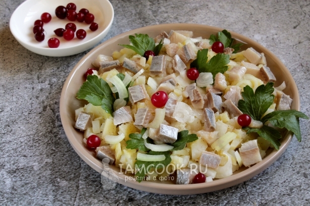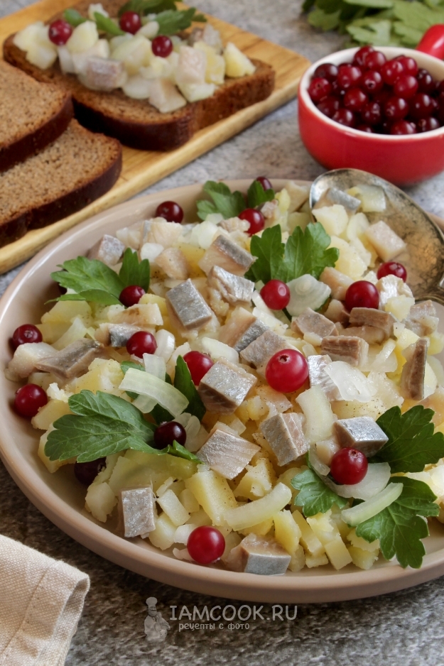 Простая, но очень аппетитная закуска для любителей селедки. Особенность — в клюкве. Ее кислые, с легкой терпкостью ягоды удачно сочетаются с сельдью и холодной картошкой, освежают и дополняют резкость репчатого лука.