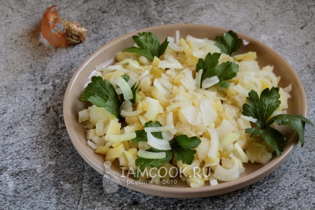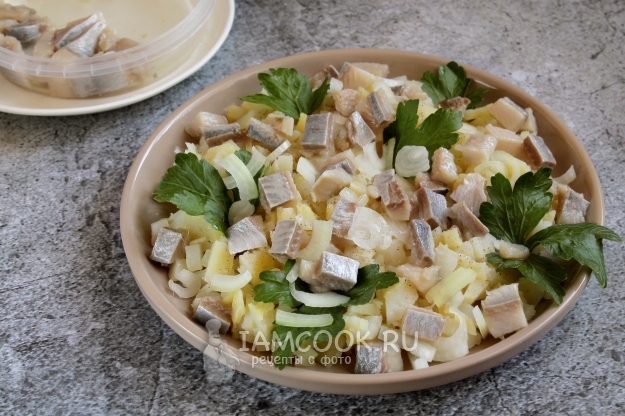 Добавляем кусочки филе сельди. Можно слегка сбрызнуть постным маслом.
