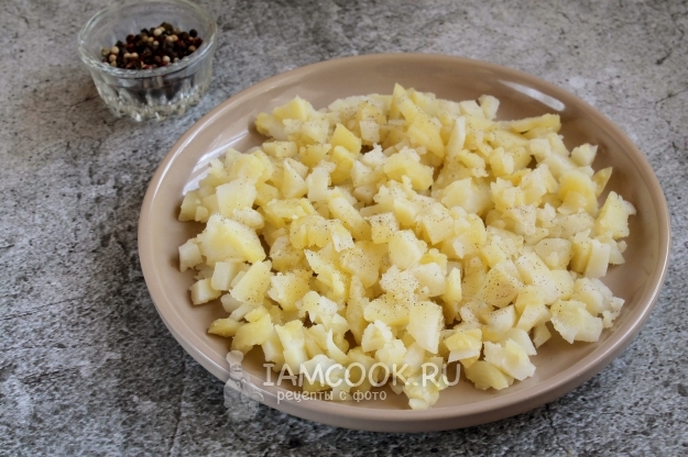 Очистив, картошку рубим и равномерно распределяем по плоской тарелке, перчим.