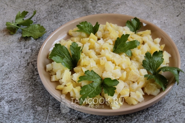 Возьмите продукты по списку. Заранее отварите и остудите картофель в мундире.