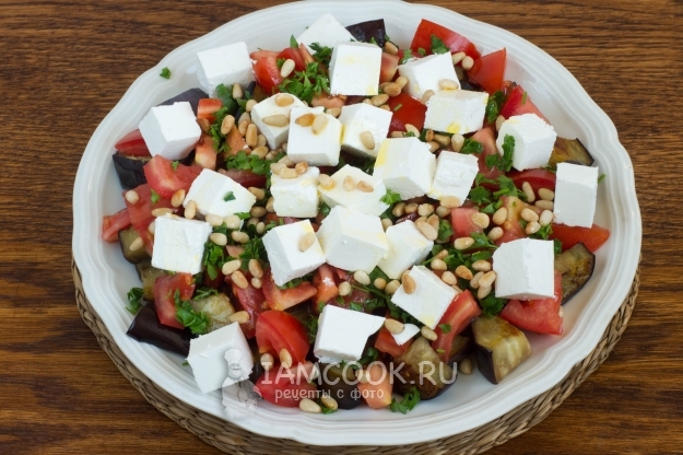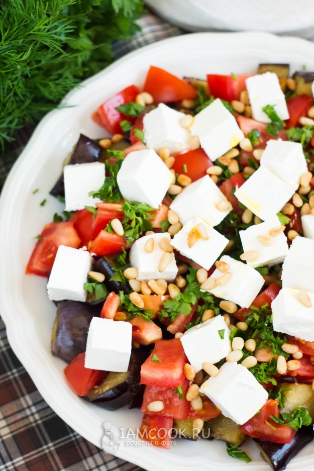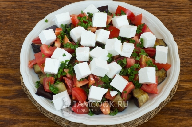Готовый салат из баклажанов, помидоров и сыра фета подавайте сразу же после приготовления.