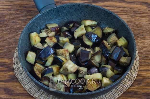 Промойте ломтики баклажанов, встряхните и высушите полотенцем (чтобы не брызгались). На сковородке разогрейте 2 ст.л. растительного масла, выложите баклажаны и обжаривайте, периодически помешивая, до мягкости и подрумянивания.