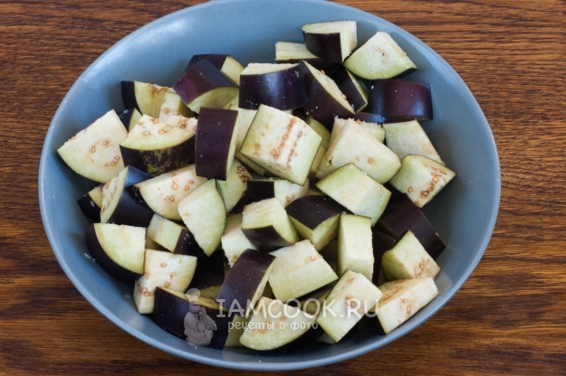 Баклажаны промойте, срежьте кончики. Нарежьте баклажаны на кусочки среднего размера. Посолите, перемешайте и отставьте в сторону на 10-15 минут.