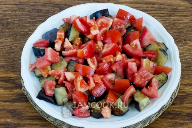 Готовые баклажаны остудите, сбрызните яблочным уксусом, добавьте немного соли и перца черного молотого, перемешайте и выложите слоем на широкое плоское блюдо. Помидоры промойте, нарежьте небольшими ломтиками и положите сверху на баклажаны.
